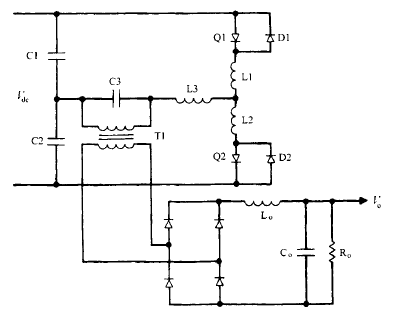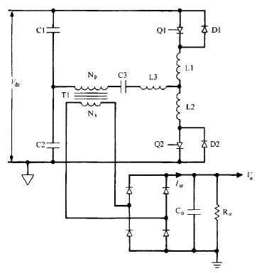 諧振型半橋電路 ( 圖 6.10 ) 和全橋電路 ( 圖 6.11 ) 是最有用的 SCR 電路。半橋電路僅用 兩個額定有效值為 SOOY 、45A 的 SCR ( Marconi ACR25U08LG ),就能夠從經過整流的220V交流電網上獲取高達4kW的交流或直流輸出功率。若器件額定電壓為1200V,則用全橋電路能夠輸出8kW的功率。全橋電路的工作原理與半橋諧振電路類似,當然若輸出相同功率,全橋電路中SCR接受的電壓應力將是半橋的兩倍,電流應力則為其一半。下面將細致引見半橋電路。半橋電路可工作于串聯負載狀態 ,如圖 6.10 所示,次級負載經過變壓器 Tl 折算到初級 與諧振電路發作串聯諧振(Ql導通時,Cl與L3和L1發作串聯諧振:Q2導通時,Cl與L3和L2發作串聯諧振) 。在串聯負載電路中 ,次級負載折算到初級的阻抗不能太高 ,否則諧振 電路的 Q 值太低 ,當諧振電流反向時 ,原先導通的 SCR 就會無法牢靠關斷 。電路無需輸出 電感,因而在輸出高壓或低壓的場所都適用。正常工作時,由于負載和LC串聯,與LC元件相比阻抗很小,所以該電路能夠平安地接受輸出端短路。但是該電路MOS管驅動輸出端不能開路 ,這 將在下面停止闡述 。