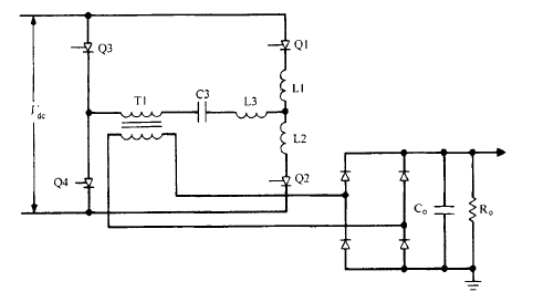 圖 6.11     SCR 諧振全橋電路 。它的輸出功率能到達半橋電路輸出功率的兩倍半橋電路也能夠工作在并聯負載狀態 ,如圖 6.12 所示,輸出負載經過 Tl 折算到初級 , 調和振電容 C3 并聯。輸出負載折算到 Tl 初級的阻抗不能太小 ,否則會形成諧振電路的 Q 值太低而無法牢靠關斷 SCR  的狀況。因而,該電路輸出端能夠開路 ,但不能短路。串聯負載電路可作為驅動Tl初級的電流源停止剖析,而并聯負載電路可作為驅動Tl初級的電壓源停止剖析。當請求輸出直流時,并聯負載電路需求次級輸出電感 ,但對碳化硅二極管輸出電壓 紋波請求不高時也能夠省略 。因而,關于 DC/DC  變換器,串聯負載電路是一個更好的選擇 。