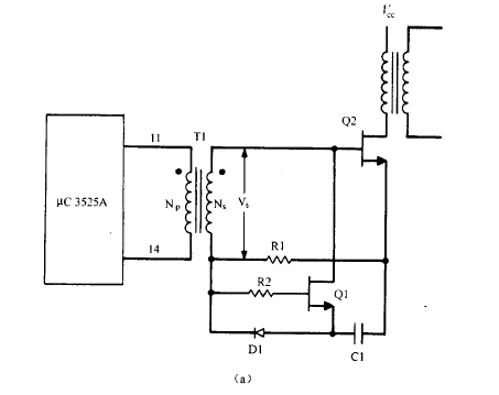假設(shè)( 圖 8.14 C b ) 電壓在 Q2 半個(gè)周期的部分時(shí)間內(nèi)為高 ,其余時(shí)間內(nèi) Q2 將 關(guān)斷 ( Q2 的死區(qū)),Ns 上的電壓被鉗位為零 。在下半個(gè)周期里 ,電壓反向?qū)Υ判倪M(jìn)行復(fù)位。將芯片的輸出腳 11 和輸出腳 14 連接于初級(jí),就可以獲得所需的波形了。適當(dāng)選擇變壓器Tl 的比使次級(jí)電壓 Vs 約為 4V。再選擇合適的電阻 RI ,給 Q2 基極限流 ,并能夠以要求的速度將 P 值最小的晶體管MOS管驅(qū)動(dòng)至飽和導(dǎo)通 ,即