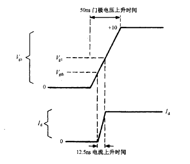 圖若柵極電壓上升時(shí)間為 50ns ,則漏極電流上升時(shí)間為 12.5ns。柵極電壓從 ov 上升到 2.5V 的闕 值電壓的時(shí)間只是一個(gè)延遲時(shí)間 。當(dāng)柵極電壓達(dá)到 5 7V 時(shí),大部分漏極電流已經(jīng)建立起來。