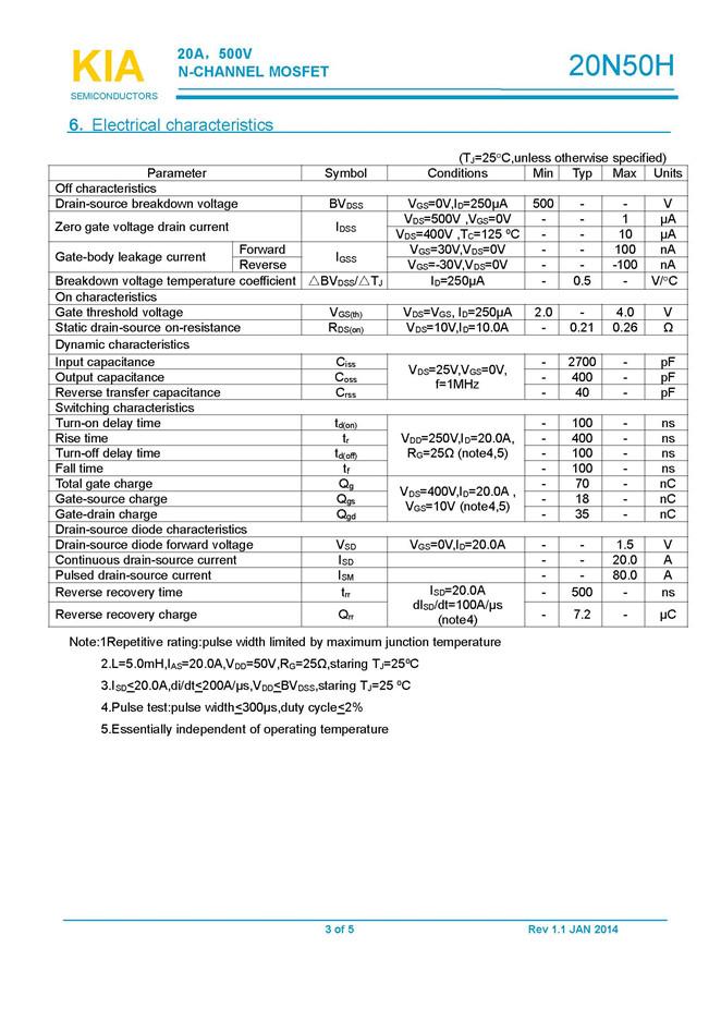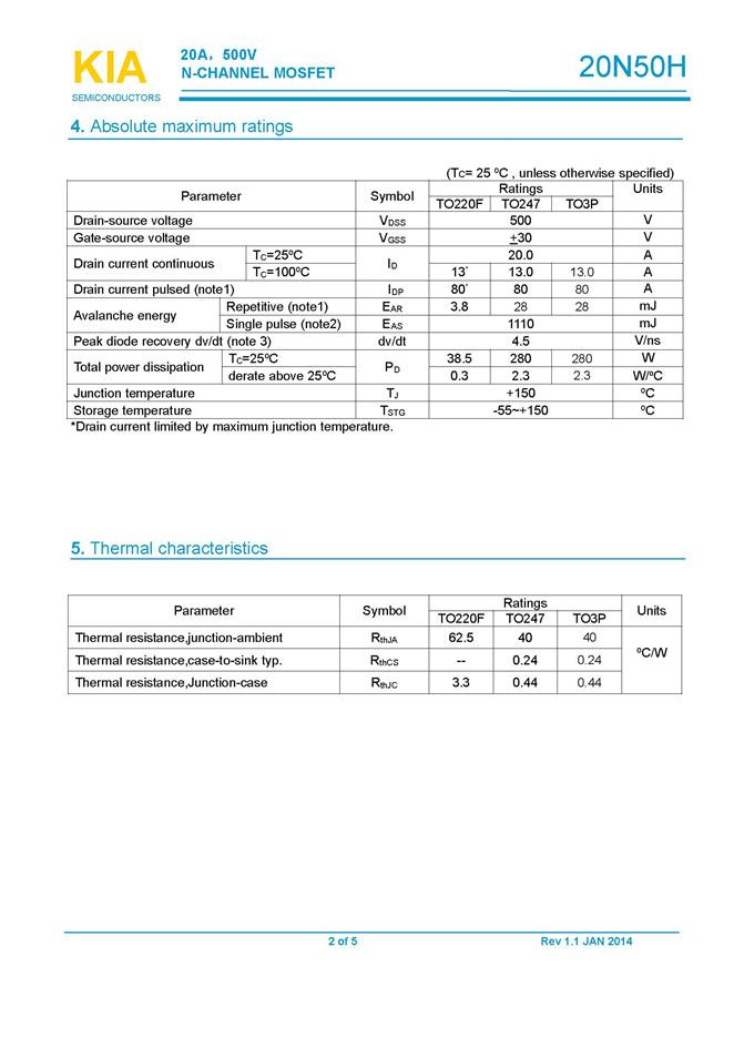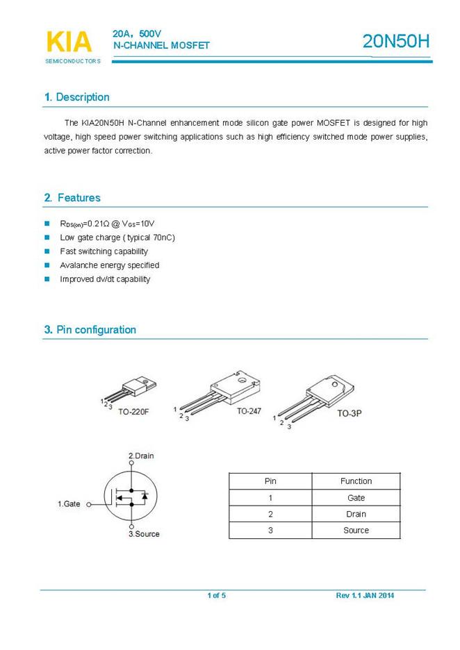 參數: ID(A): 20    BVDSS(V): 500    RDS(ON): 0.26    Qg(nC): 70    Package: TO-220F、TO-3P、TO-247